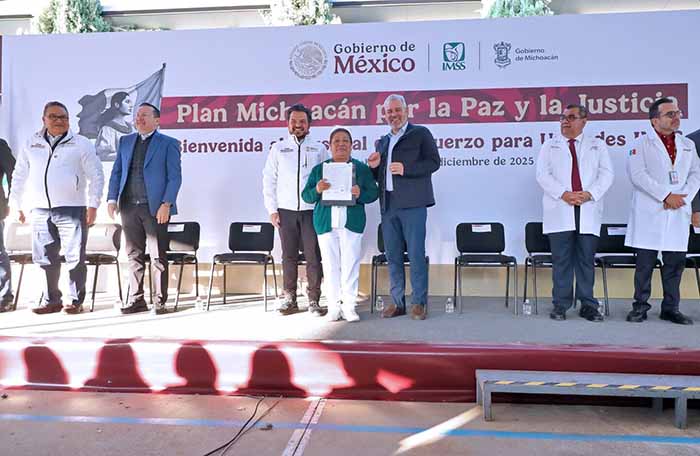 Ciudad de México; 16 de Diciembre de 2025.- A través de un enlace desde Palacio Nacional a Morelia, Michoacán, la Presidenta de México, Claudia Sheinbaum Pardo, encabezó la entrega de basificaciones a 270 nuevos trabajadores de Salud: médicas, médicos, enfermeras, enfermeros y paramédicos, que se incorporan a hospitales rurales y de zona del Instituto Mexicano del Seguro Social (IMSS) como parte del Plan Michoacán por la Paz y la Justicia.