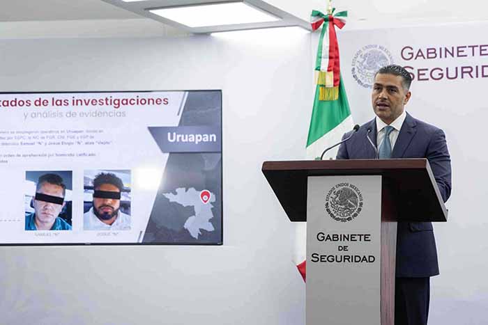 Ciudad de México; 11 de Enero de 2026.- El titular de la Secretaría de Seguridad y Protección Ciudadana (SSPC), Omar García Harfuch, confirmó la detención de Samuel «N», exdirector de Relaciones Públicas y Protocolo y Josué Elogio «N» alias «Viejito», quien se desempeñaba como taxista, relacionados a la investigación por el homicidio del alcalde de Uruapan, Michoacán, Carlos Manzo el 1 de noviembre en el festival de las velas.