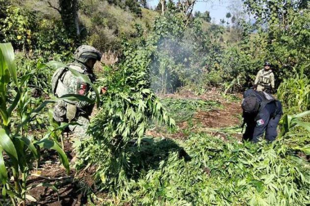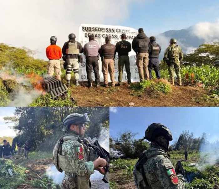 Ciudad de México; 18 de Enero de 2026.- Elementos de la Guardia Nacional (GN) y Ejército localizaron en el municipio de Santiago el Pinar, Chiapas cuatro plantíos de marihuana con una superficie de casi 10 mil metros cuadrados.
