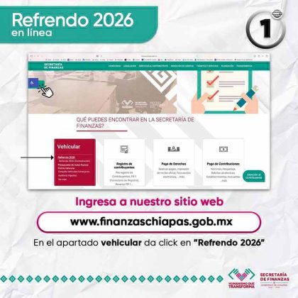 Tuxtla Gutiérrez, Chiapas.– Con el objetivo de eliminar las aglomeraciones y agilizar la atención, la Secretaría de Finanzas ha modernizado el proceso del Refrendo Vehicular 2026. Ahora, las y los ciudadanos pueden realizar su pago totalmente en línea y mediante un sistema de citas programadas, acudir directo a recoger su tarjeta de circulación de forma rápida y sin filas.
