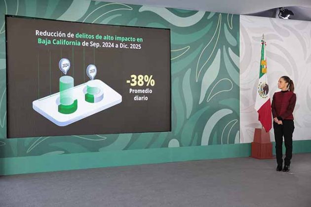 “Es muy importante el resultado de la disminución de delitos en Baja California, muy importante. Nada más desde que llegamos al gobierno, septiembre 2024 fue un mes muy alto, 7.13 homicidios diarios, en este momento 4.13, por supuesto que tenemos que seguir disminuyendo, pero es una disminución del 42 por ciento”, puntualizó en la conferencia matutina “Las mañaneras del pueblo”, que se realizó en el Cuartel General de la 2ª Zona Militar.