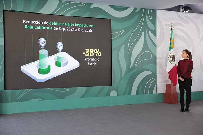 La titular del Secretariado Ejecutivo del Sistema Nacional de Seguridad Pública, Marcela Figueroa Franco, detalló que los homicidios dolosos por año presentaron una reducción de 28 por ciento respecto a 2024, lo que hace de 2025 el año más bajo desde 2018, al pasar de 6.5 en 2024 a 4.7 en 2025. Además, el promedio diario de delitos de alto impacto presentó una reducción del 38 por ciento al pasar de 10.43 en septiembre de 2024 a 6.48 en diciembre de 2025; mientras que de forma anual la disminución de los delitos de alto impacto es del 32 por ciento de enero de 2024 a diciembre de 2025.