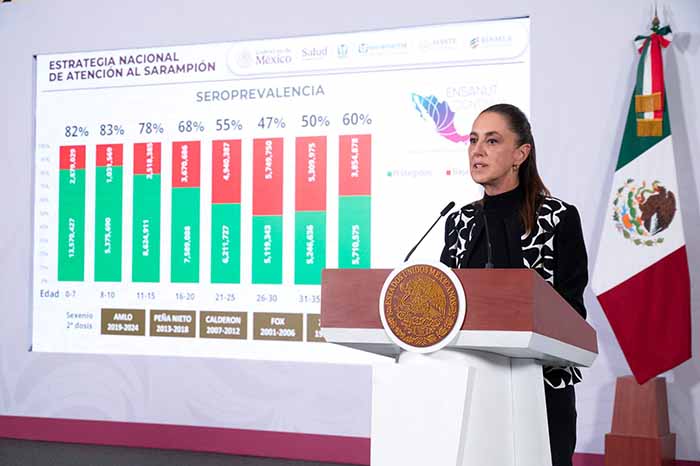 Ciudad de México, 11 de febrero de 2026.- La Presidenta de México, Claudia Sheinbaum Pardo, puntualizó que la mayoría de las mexicanas y los mexicanos están vacunados contra el sarampión, por ello, hizo un llamado a mantener la calma, ya que la Estrategia para controlar los brotes de esta enfermedad funciona, como sucedió en Chihuahua, además de que hay 28 millones de vacunas disponibles en 21 mil 154 puntos en todo el país y cuya ubicación puede consultarse en dondemevacuno.salud.gob.mx.