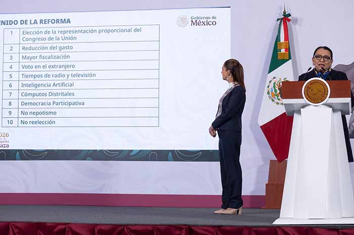 Ciudad de México, 25 de febrero de 2026.- En cumplimiento al compromiso que asumió con el pueblo de México y a sus principios, la Presidenta Claudia Sheinbaum Pardo presentó la iniciativa de reforma constitucional en materia electoral, que será enviada el lunes 2 de marzo al Congreso de la Unión, la cual se compone de 10 puntos: 1. Eliminación de las listas de los partidos políticos para la representación proporcional del Congreso de la Unión; 2. Reducción del 25 por ciento en el costo de las elecciones; 3. Mayor fiscalización; 4. Voto en el extranjero; 5. Disminución de los tiempos de radio y televisión de 48 a 35 minutos diarios; 6. Regulación del uso de Inteligencia Artificial y prohibición de bots; 7. Cómputos Distritales; 8. Democracia Participativa; 9. No nepotismo; y 10. No reelección.