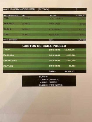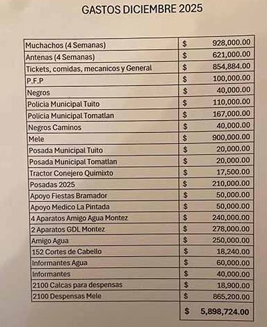 Según otra hoja de «Gastos diciembre 2025», entre otros gastos que se reportaron, fueron los pagos a «muchachos (4 semanas)» 928 mil pesos, y a las «antenas (4 semanas)», 621 mil pesos. También, entre los gastos están «tickets, comidas, mecánicos, y general», «P.F.P.», «Negros» por 40 mil pesos; «Policía Municipal Tuito, Policía Municipal Tomatlán», que recibió más de 100 mil pesos.