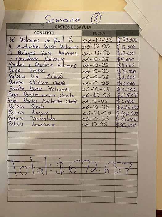En otro desglose por 576 mil 490 pesos, de diciembre de 2025 y titulada «Gastos de Tapalpa», se revela que el capo gastó 138 mil pesos en concepto «policía Tapalpa» y 86 mil pesos en «policía Chikilistlán» (Chiquilistlán).