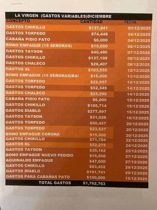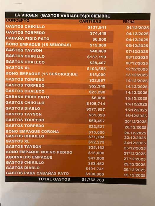 En otra hoja hecha a computadora, llamada «La Virgen (gastos variables) diciembre», se desglosa el concepto de pago, la cantidad y la fecha que va del 1 al 29 de diciembre del 2025. Entre los conceptos a pagar están dos llamados «bono empaque (15 señoras)», cada uno marca un costo de 15 mil pesos.