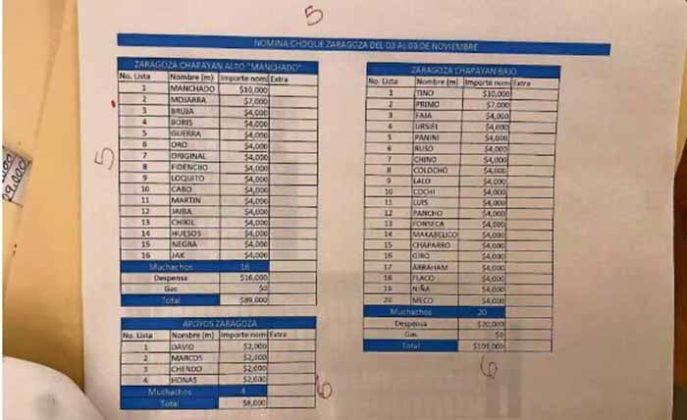 El documento de su «nómina de choque» también exhibe un gasto de 89 mil pesos hacia el concepto «Zaragoza Chapayan Alto ‘Manchado'», en donde se realizan pagos de despensa y gas a 16 «muchachos».