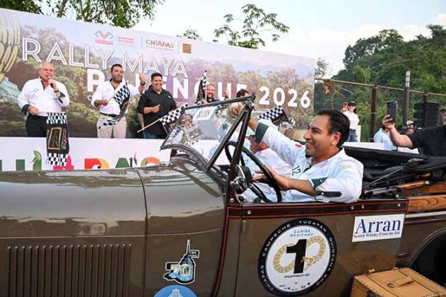 Más tarde, a bordo de un auto Ford Pick Up modelo 1928, el gobernador dio el banderazo de salida al Rally Maya Palenque 2026, competencia de automóviles históricos que conjuga turismo carretero con un recorrido por los paisajes y culturas del Sur Sureste. Este nuevo trayecto contempla su paso por Chiapas, Campeche, Yucatán y Quintana Roo.