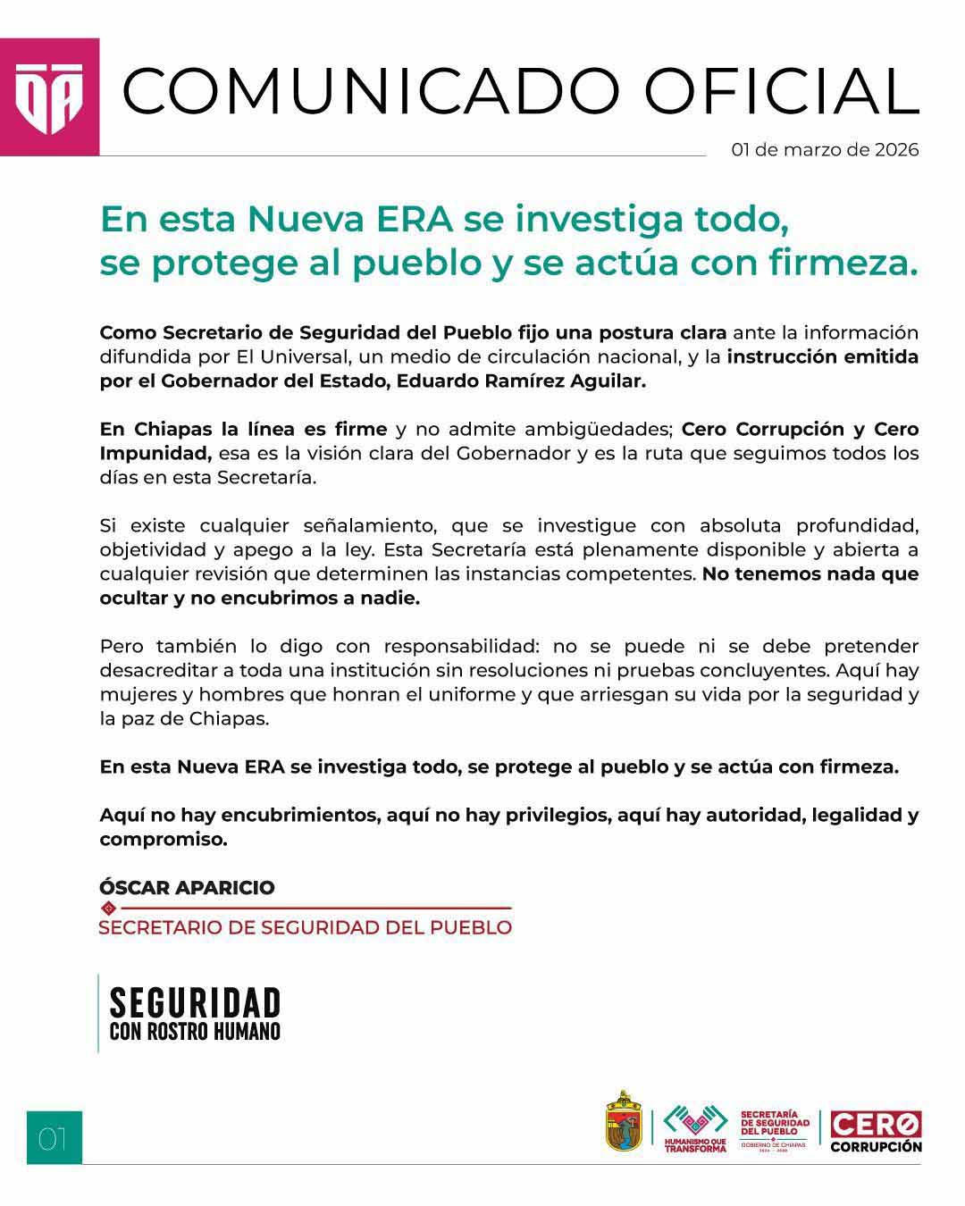 Por su parte, el secretario de Seguridad Pública de Chiapas, Óscar Aparicio Avendaño, declaró que «si existe cualquier señalamiento, que se investigue con absoluta profundidad, objetividad y apego a la ley». Esta Secretaría está plenamente abierta a cualquier revisión que determinen las instancias competentes. No tenemos nada que ocultar y no encubriremos a nadie».