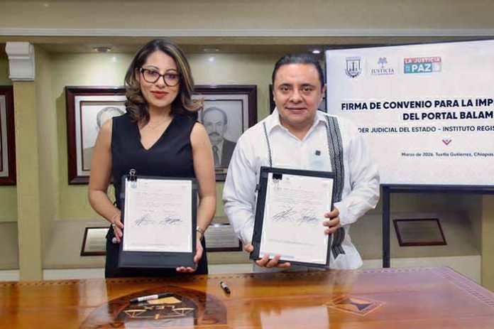 El magistrado presidente del Poder Judicial del Estado de Chiapas, Juan Carlos Moreno Guillén, encabezó junto a la directora general del Instituto Registral del Estado, Adriana Mercedes Ramos Díaz, la firma de convenio de colaboración para la implementación del “Portal Balam”, una herramienta tecnológica orientada a fortalecer la interconexión institucional y agilizar los procesos judiciales.