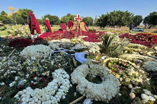 Zapopan, Jal., 6 de Marzo.- Cinco días después de la sepultura de Nemesio Oseguera Cervantes alías El Mencho, la tumba del líder criminal permanece cubierta por más de una decena de coronas de luto y arreglos florales de rosas rojas y blancas.