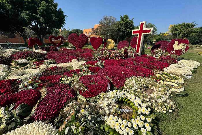 Entre Coronas y Rosas con Figuras de Gallo la Tumba de “El Mencho”