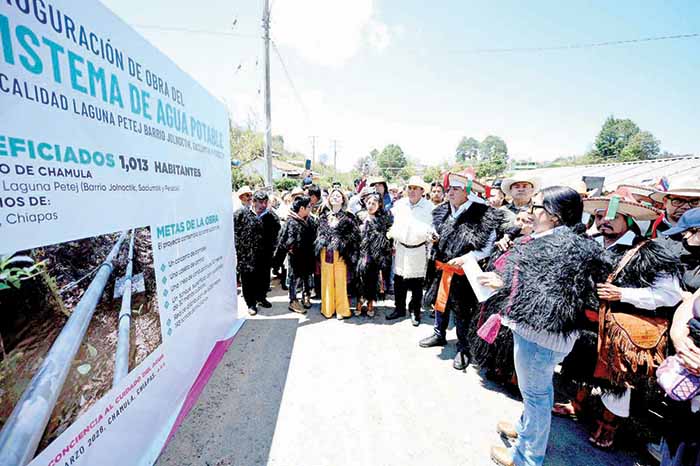 La directora general de la Comisión Estatal del Agua y Saneamiento, Karina Montesinos Cárdenas, explicó que en la localidad Laguna Petej, de Chamula, se construyó un cárcamo de bombeo, un tanque de almacenamiento, una red de distribución de 6 mil metros lineales y 193 tomas domiciliarias, lo que garantiza bienestar y mejores condiciones de vida a mil 500 habitantes de los barrios de Jolnoctik, Saclumtik y Pereztik.