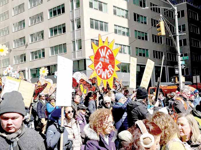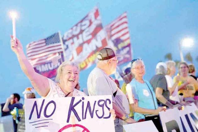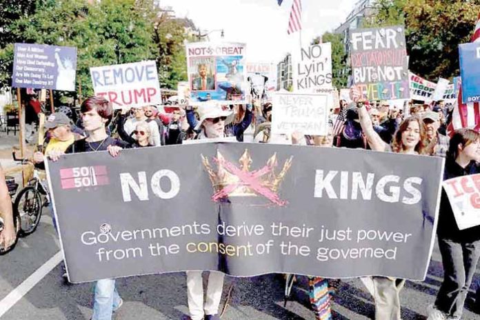 Nueva York y Washington. “El cambio de régimen empieza en casa” ,decía una pancarta, uno de incontables mensajes de repudio y resistencia contra el gobierno de Donald Trump en la magna movilización de protesta nacional “No a los reyes” realizada en más de 3 mil actos por todo Estados Unidos este sábado en lo que organizadores esperaban sería el día de protesta nacional más grande de la historia del país.