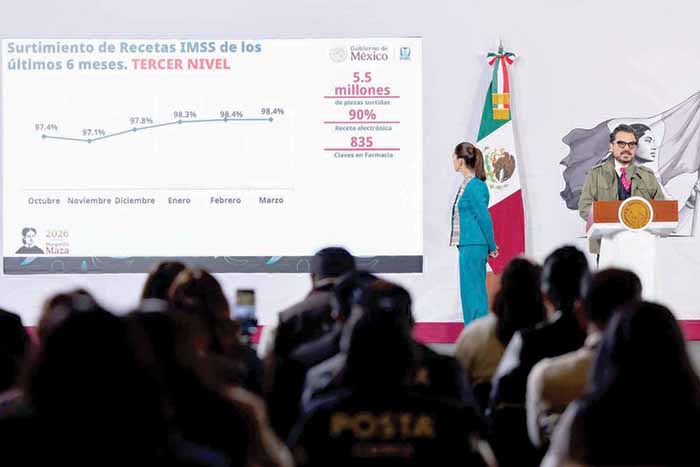 Ciudad de México, 31 de marzo de 2026.- La Presidenta de México, Claudia Sheinbaum Pardo, destacó que el promedio de abasto de medicamentos es de más del 97 por ciento en las tres instituciones de salud pública, el Instituto Mexicano del Seguro Social (IMSS), el IMSS Bienestar y el Instituto de Seguridad y Servicios Sociales de los Trabajadores del Estado (ISSSTE) y puntualizó que se continúa trabajando para llegar al 100 por ciento.