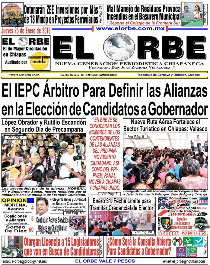 InicioPortadasENERO 25 DE 2018 Portadas ENERO 25 DE 2018 25 enero, 2018 0 1887 Cuota FacebookTwitterPinterestWhatsAppEmail EDICION IMPRESA PARA VER LA EDICION IMPRESA PULSE EN LA IMAGEN DE ABAJO Cuota FacebookTwitterPinterestWhatsAppEmail Artículo anteriorEl IEPC Árbitro Para Definir las Alianzas en la Elección de Candidatos a GobernadorArtículo siguienteENERO 26 DE 2018 RELATED ARTICLES Portadas DICIEMBRE 08 DE 2025 8 diciembre, 2025 Portadas DICIEMBRE 07 DE 2025 7 diciembre, 2025 Portadas DICIEMBRE 06 DE 2025 6 diciembre, 2025 EL ORBE AL MOMENTO: Conferencia de prensa en vivo. Lunes 08 de diciembre 2025 | Presidenta Claudia Sheinbaum Al Instante staff - 8 diciembre, 2025 0 Te invitamos a seguir la transmisión en vivo de la conferencia matutina: #MañaneradelPueblo, encabezada por la Dra. Claudia Sheinbaum Pardo, Presidenta Constitucional de los... Leer más Desfile Navideño Llena de Alegría las Calles de la Ciudad Al Instante staff - 8 diciembre, 2025 0 Con un ambiente lleno de color, música y espíritu festivo, el Colegio Humanista Abraham Maslow (CHAM), dirigido por la maestra Nancy Renoc y el... Leer más Chiapas en paz: Eduardo Ramírez Al Instante staff - 7 diciembre, 2025 0 • Al rendir su Primer Informe de Gobierno ante el pueblo, aseguró que a un año de trabajo se cumple la palabra empeñada, reafirmando que... Leer más Cargar más MAS Popular Reconoce Magistrado Juan Carlos Moreno la Invaluable Labor del Gobernador de Chiapas 8 diciembre, 2025 Basurero Clandestino en Huixtla Genera Contaminación 8 diciembre, 2025 Fotógrafos de Tapachula Viven su Temporada Más Fuerte Durante el Mes de Diciembre 8 diciembre, 2025 Detienen a 12 Personas por Presuntos Delitos Contra la Salud y Violación a la Ley Federal de Armas 8 diciembre, 2025 Cargar más