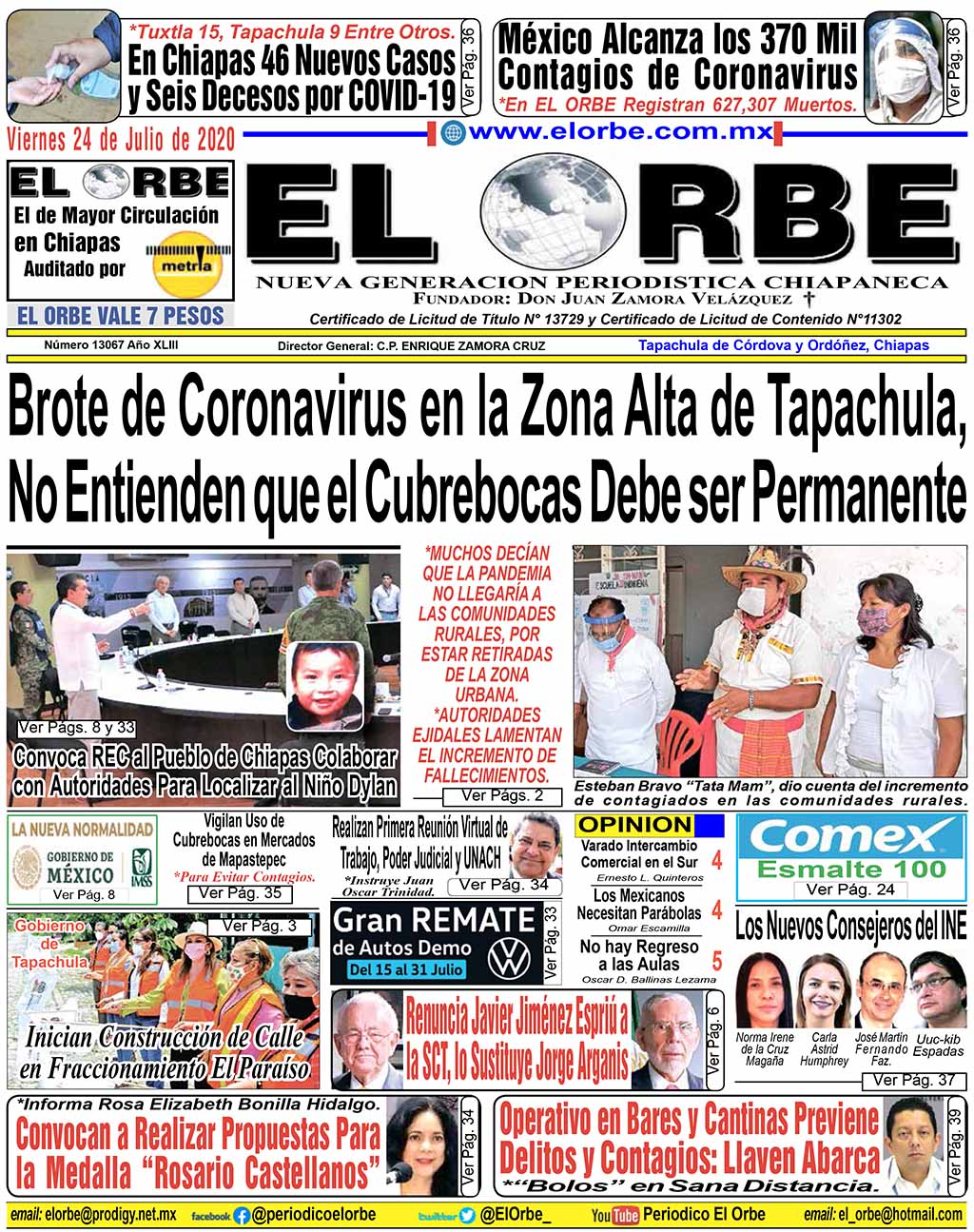 Artículo anteriorA 150 días de la pandemia, Chiapas registra 5 mil 124 casos acumulados y 415 defunciones de COVID-19, informó este jueves la Secretaría de Salud del estado, además de resaltar que recientemente 136 personas fueron dados de alta. En el reporte diario de nuevos casos, se dio a conocer que en las últimas horas se confirmaron 46 pacientes positivos, 25 hombres y 21 mujeres, así como seis decesos. Los municipios que registraron casos recientes son los siguientes: Tuxtla Gutiérrez, 15; Tapachula, ocho; Ocozocoautla, cinco; Cacahoatán, tres; Mazatán, San Cristóbal de Las Casas, Tonalá y Venustiano Carranza, dos cada uno; y Altamirano, Ángel Albino Corzo, Benemérito de las Américas, Berriozábal, Juárez, Motozintla y Reforma, un caso cada uno. Entre las defunciones está la de un señor de 48 años de edad y otro de 59, ambos con residencia en el municipio de Tapachula. En cuanto a los pacients recuperados, la Secretaría de Salud comunicó que en las últimas horas fueron dadas de alta 136 personas, por lo que suman 3