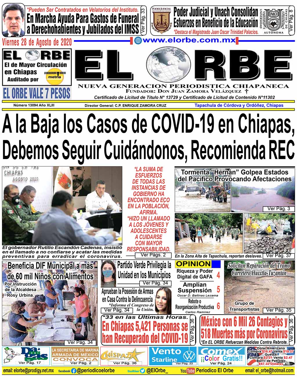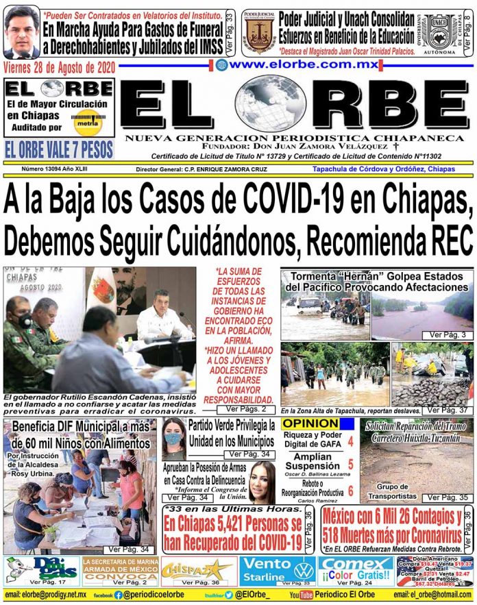 Artículo anteriorCon el fin de continuar salvaguardando la integridad de la población usuaria, ante el riesgo que representa la movilidad de personas para la propagación del COVID-19, la Secretaría de Salud informo que se amplió la suspensión de labores en la administración pública estatal hasta el próximo 16 de septiembre. Ademásx este jueves se confirmó 13 casos positivos en siete hombres y seis mujeres, entre ellos un menor de edad, además de dos decesos . Los casos recientes fueron en los municipios de Tuxtla Gutiérrez y Tapachula, tres; y Catazajá, Las Margaritas, Ocosingo, Palenque, Pichucalco, Sabanilla y Unión Juárez, un caso cada uno. Entre los decesos está la de un señor de 73 años, residente del municipio de Tapachula, quien padecía de diabetes, hipertensión y tabaquismo.