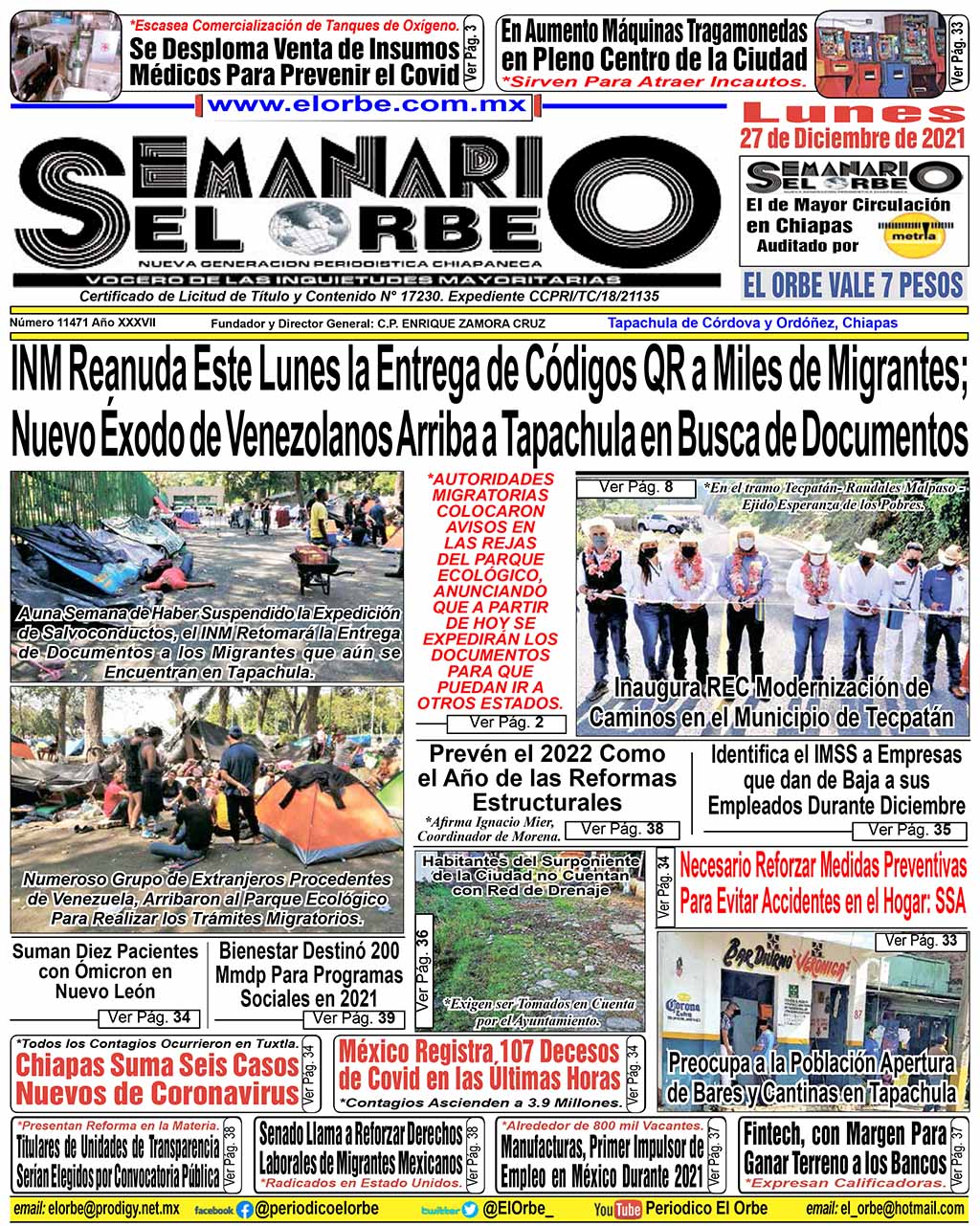 InicioPortadasDICIEMBRE 27 DE 2021 Portadas DICIEMBRE 27 DE 2021 27 diciembre, 2021 0 968 Cuota FacebookTwitterPinterestWhatsAppEmail Cuota FacebookTwitterPinterestWhatsAppEmail Artículo anteriorRatifica Chiapas a la SRE, Fuerzas Armadas e INM, Compromiso Para Fortalecer las Acciones a Favor del Rescate y Respeto a los Derechos del Migrante: RECArtículo siguienteSuman Diez Pacientes con Ómicron en Nuevo León RELATED ARTICLES Portadas DICIEMBRE 20 DE 2025 20 diciembre, 2025 Portadas DICIEMBRE 19 DE 2025 19 diciembre, 2025 Portadas DICIEMBRE 18 DE 2025 18 diciembre, 2025 EL ORBE AL MOMENTO: CONALEP Tuxtla Chico Celebra la Navidad con Talent Show Estudiantil Al Instante staff - 20 diciembre, 2025 0 Con una tarde llena de talento y espíritu navideño, el CONALEP Tuxtla Chico, que dirige la maestra María Guadalupe García Muñoz, realizó el “Talent... Leer más Vocación y compromiso por el bienestar en Chiapas Al Instante staff - 19 diciembre, 2025 0 El magistrado presidente del Poder Judicial del Estado de Chiapas, Juan Carlos Moreno Guillén, asistió al acto encabezado por el gobernador del estado, Eduardo... Leer más MÉXICO: UN PAÍS CAFETALERO DE RELEVANCIA GLOBAL Al Instante staff - 19 diciembre, 2025 0 Desde hace más de un siglo, el café forma parte de nuestra identidad cultural y productiva, consolidándose como un motor económico y social para... Leer más Cargar más MAS Popular CONALEP Tuxtla Chico Celebra la Navidad con Talent Show Estudiantil 20 diciembre, 2025 Ayuntamiento de Tapachula Entrega Uniformes e Implementos a Delegados y Agentes Municipales 20 diciembre, 2025 Arranca el Operativo Invierno 2025 en Puerto Madero 20 diciembre, 2025 Alrededor de 40 Comercios han Cerrado en el Primer Cuadro de Tapachula 20 diciembre, 2025 Cargar más