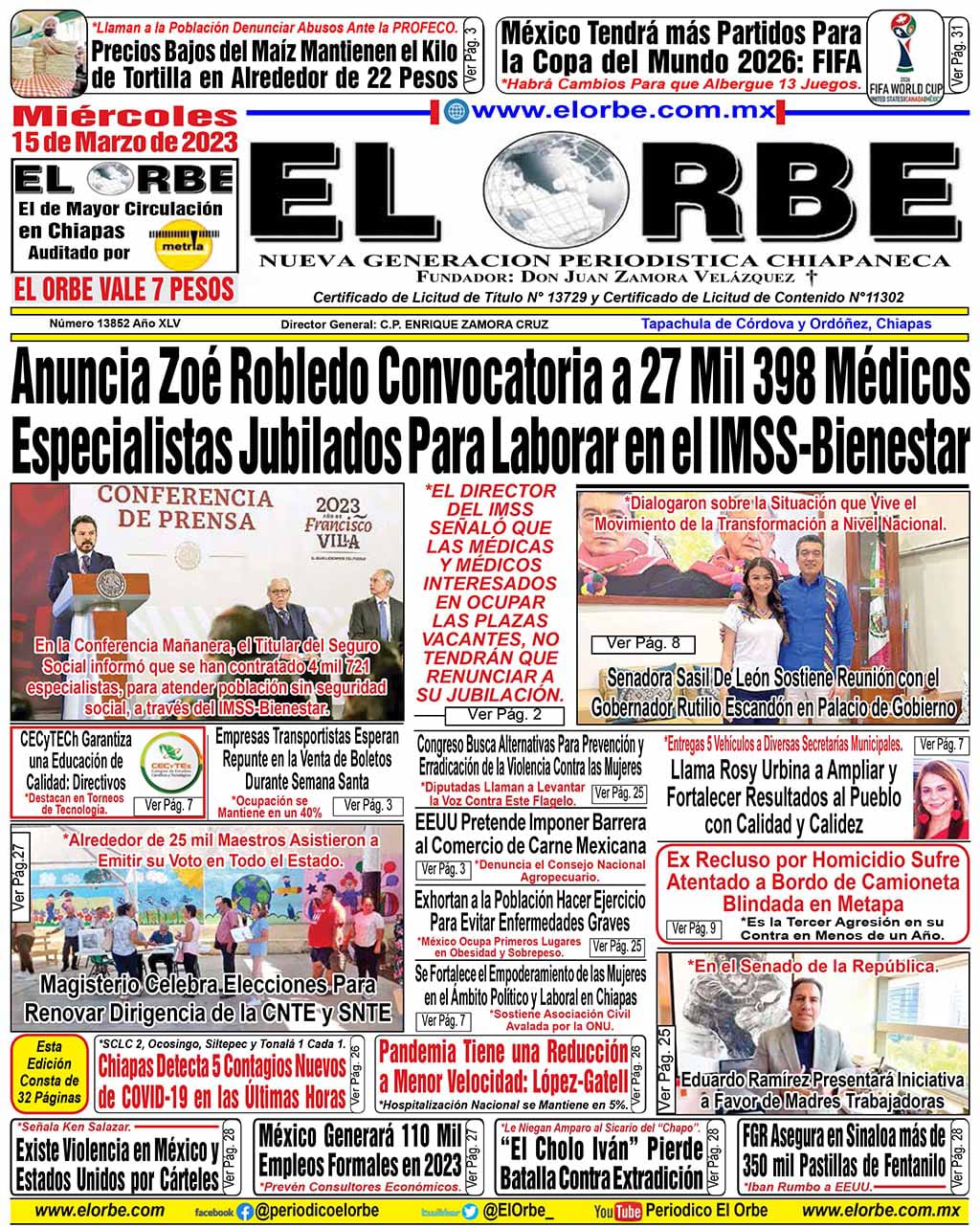 InicioPortadasMARZO 15 DE 2023 Portadas MARZO 15 DE 2023 15 marzo, 2023 0 1150 Cuota FacebookTwitterPinterestWhatsAppEmail Cuota FacebookTwitterPinterestWhatsAppEmail Artículo anteriorEL ORBE AL MOMENTO Desde las primeras horas de este martes, miles de maestros dejaron las aulas en Chiapas. Sin embargo, esta vez fue para participar en las elecciones internas que permitan la renovación de la dirigencia sindical en la Sección 7 y 40 de la CNTE-SNTE.Artículo siguienteEdicto 75-2020 RELATED ARTICLES Portadas DICIEMBRE 15 DE 2025 15 diciembre, 2025 Portadas DICIEMBRE 14 DE 2025 14 diciembre, 2025 Portadas DICIEMBRE 13 DE 2025 13 diciembre, 2025 EL ORBE AL MOMENTO: Poder Judicial dicta sentencia condenatoria de 30 años de prisión a responsable de Feminicidio en Grado de Tentativa Al Instante staff - 15 diciembre, 2025 0 -Con estas sentencias se garantiza que los actos que atenten contra la integridad y la vida de las mujeres, niñas y adolescentes no queden... Leer más Tuxtla Capital Segura Al Instante staff - 15 diciembre, 2025 0 Hablaremos sobre la incidencia delictiva de Tuxtla Gutiérrez, asimismo sobre el esclarecimiento de diversos hechos de relevancia en Chiapas. Leer más Invitan a Turistas a Realizar Ascenso Seguro al Volcán Tacaná Durante Temporada Decembrina Al Instante staff - 15 diciembre, 2025 0 • El ascenso puede durar entre 8 y 12 horas, por lo que recomiendan a quienes no conocen la ruta contratar guías comunitarios certificados. Unión Juárez,... Leer más Cargar más MAS Popular Poder Judicial dicta sentencia condenatoria de 30 años de prisión a responsable de Feminicidio en Grado de Tentativa 15 diciembre, 2025 Tuxtla Capital Segura 15 diciembre, 2025 Invitan a Turistas a Realizar Ascenso Seguro al Volcán Tacaná Durante Temporada Decembrina 15 diciembre, 2025 Inconciencia Social Genera Contaminación en Fuente del Parque Central Miguel Hidalgo 15 diciembre, 2025 Cargar más
