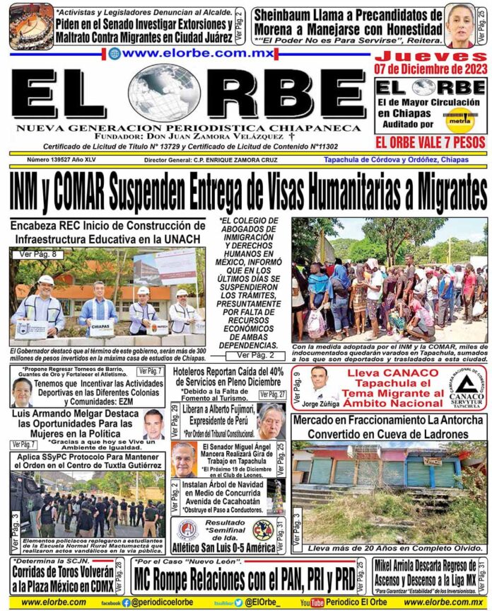 InicioPortadasDICIEMBRE 07 DE 2023 Portadas DICIEMBRE 07 DE 2023 7 diciembre, 2023 0 367 Cuota FacebookTwitterPinterestWhatsAppEmail Cuota FacebookTwitterPinterestWhatsAppEmail Artículo anteriorMC Rompe Relaciones con el PAN, PRI y PRDArtículo siguienteSheinbaum Llama a Precandidatos de Morena a Manejarse con Honestidad RELATED ARTICLES Portadas ENERO 12 DE 2025 12 enero, 2026 Portadas ENERO 11 DE 2026 11 enero, 2026 Portadas ENERO 10 DE 2026 10 enero, 2026 EL ORBE AL MOMENTO: «EN TAPACHULA LA NIÑEZ TRANSFORMA»: YAMIL MELGAR. Al Instante staff - 12 enero, 2026 0 •Premian a ganadores del Primer Concurso de Dibujo "Calles Limpias y Seguras". Leer más Eduardo Ramírez atestigua Asamblea del Pueblo en San Juan Cancuc y fortalece acciones prioritarias Al Instante staff - 12 enero, 2026 0 La población eligió de forma libre y democrática la realización de una obra de electrificación Benefició a mil 722 niñas y niños con calzado deportivo... Leer más Entrevista con la Maestra Viridiana Figueroa García , Directora General del COBACH Al Instante staff - 12 enero, 2026 0 En Tapachula, llevamos a cabo la inauguración de obras en el Cobach y en la Escuela Secundaria Técnica Pesquera Número 72. Hemos beneficiado a... Leer más Cargar más MAS Popular «EN TAPACHULA LA NIÑEZ TRANSFORMA»: YAMIL MELGAR. 12 enero, 2026 Eduardo Ramírez atestigua Asamblea del Pueblo en San Juan Cancuc y fortalece acciones prioritarias 12 enero, 2026 Entrevista con la Maestra Viridiana Figueroa García , Directora General del COBACH 12 enero, 2026 Mujeres víctimas de violencia contarán con botón de alerta conectado al C5: Llaven Abarca 12 enero, 2026 Cargar más