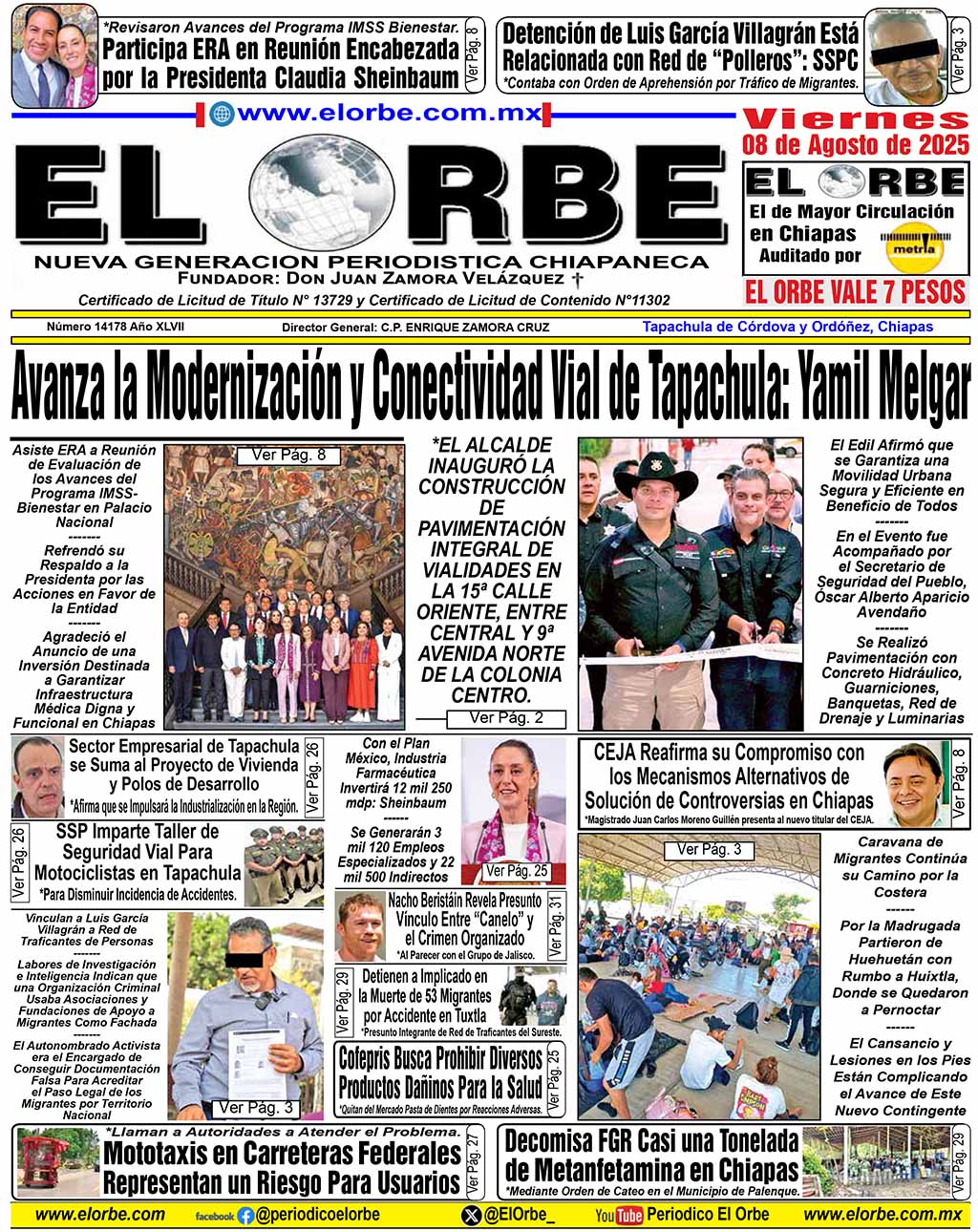 InicioPortadasAGOSTO 08 DE 2025 Portadas AGOSTO 08 DE 2025 8 agosto, 2025 0 229 Cuota FacebookTwitterPinterestWhatsAppEmail Cuota FacebookTwitterPinterestWhatsAppEmail Artículo anteriorPoder Judicial Impone Sentencia Condenatoria por el Delito de PederastiaArtículo siguienteDenuncian Presuntas Desapariciones de Personas en la Sierra RELATED ARTICLES Portadas NOVIEMBRE 15 DE 2025 15 noviembre, 2025 Portadas NOVIEMBRE 14 DE 2025 14 noviembre, 2025 Portadas NOVIEMBRE 13 DE 2025 13 noviembre, 2025 EL ORBE AL MOMENTO: Tapachula FC vuelve a la senda del triunfo con una goleada ante Cañoneros Al Instante staff - 15 noviembre, 2025 0 El conjunto de Tapachula FC se reencontró con la victoria de forma contundente tras imponerse por marcador de 6-0 al conjunto de Cañoneros, en... Leer más Fuerte choque en el tramo Tapachula–Tuxtla Chico deja un lesionado Al Instante staff - 15 noviembre, 2025 0 15 de noviembre de 2025, Tapachula, Chiapas.— Minutos antes de las 19:00 horas de este sábado se registró un aparatoso accidente vehicular en el... Leer más SSP y FGE aprehenden a presunto responsable de robo con violencia agravado Al Instante staff - 15 noviembre, 2025 0 - Por hechos ocurridos el 9 de noviembre en Ixtapangajoya La Secretaría de Seguridad del Pueblo y la Fiscalía General del Estado ejecutaron una orden... Leer más Cargar más MAS Popular Tapachula FC vuelve a la senda del triunfo con una goleada ante Cañoneros 15 noviembre, 2025 Fuerte choque en el tramo Tapachula–Tuxtla Chico deja un lesionado 15 noviembre, 2025 SSP y FGE aprehenden a presunto responsable de robo con violencia agravado 15 noviembre, 2025 SSP y FGE aprehenden a presunto responsable de violación agravada 15 noviembre, 2025 Cargar más