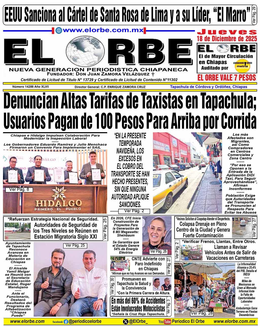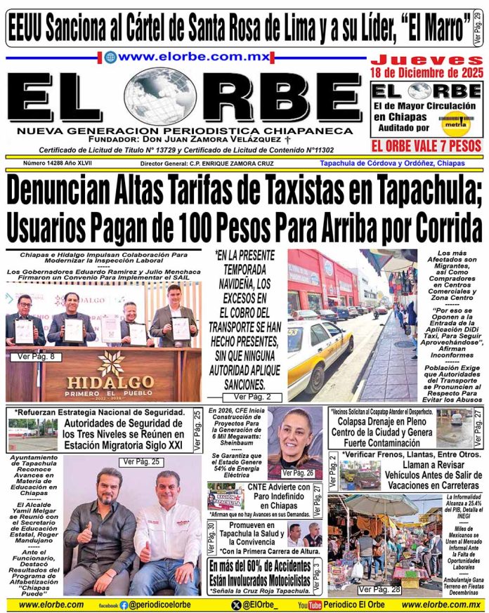 InicioPortadasDICIEMBRE 18 DE 2025 Portadas DICIEMBRE 18 DE 2025 18 diciembre, 2025 0 12 Cuota FacebookTwitterPinterestWhatsAppEmail Cuota FacebookTwitterPinterestWhatsAppEmail Artículo anteriorEEUU Sanciona al Cártel de Santa Rosa de Lima y a su Líder, «El Marro»Artículo siguienteEn 2026, CFE Inicia Construcción de Proyectos Para la Generación de 6 Mil Megawatts: Sheinbaum RELATED ARTICLES Portadas DICIEMBRE 17 DE 2025 17 diciembre, 2025 Portadas DICIEMBRE 16 DE 2025 16 diciembre, 2025 Portadas DICIEMBRE 15 DE 2025 15 diciembre, 2025 EL ORBE AL MOMENTO: Conferencia de prensa matutina. Jueves 18 de diciembre 2025 | Presidenta Claudia Sheinbaum Pardo Al Instante staff - 18 diciembre, 2025 0 Te invitamos a seguir la transmisión en vivo de la conferencia matutina: #MañaneradelPueblo, encabezada por la Dra. Claudia Sheinbaum Pardo, Presidenta Constitucional de los... Leer más ¡Gran Final hoy el Campo Córdova Uno! Al Instante staff - 18 diciembre, 2025 0 Tapachula, Chiapas.-Hoy en punto de las 15:30 horas, se jugará la gran final del Torneo Decembrino 2025, en el campo Córdova Uno, en la... Leer más María Ruth De la Cruz, Celebra su 61 Aniversario con Carrera Deportiva Al Instante staff - 18 diciembre, 2025 0 La maestra y atleta María Ruth De la Cruz Navarro, celebró la llegada de su 61 aniversario de una manera especial, llena de entusiasmo,... Leer más Cargar más MAS Popular México se Mantiene Entre los Mayores Exportadores de Alimentos 18 diciembre, 2025 Mexicanos Gastarán 4 mil Pesos en Cena Navideña Este 2025 18 diciembre, 2025 Conferencia de prensa matutina. Jueves 18 de diciembre 2025 | Presidenta Claudia Sheinbaum Pardo 18 diciembre, 2025 Denuncian Altas Tarifas de Taxistas en Tapachula; Usuarios Pagan de 100 Pesos Para Arriba por Corrida 18 diciembre, 2025 Cargar más