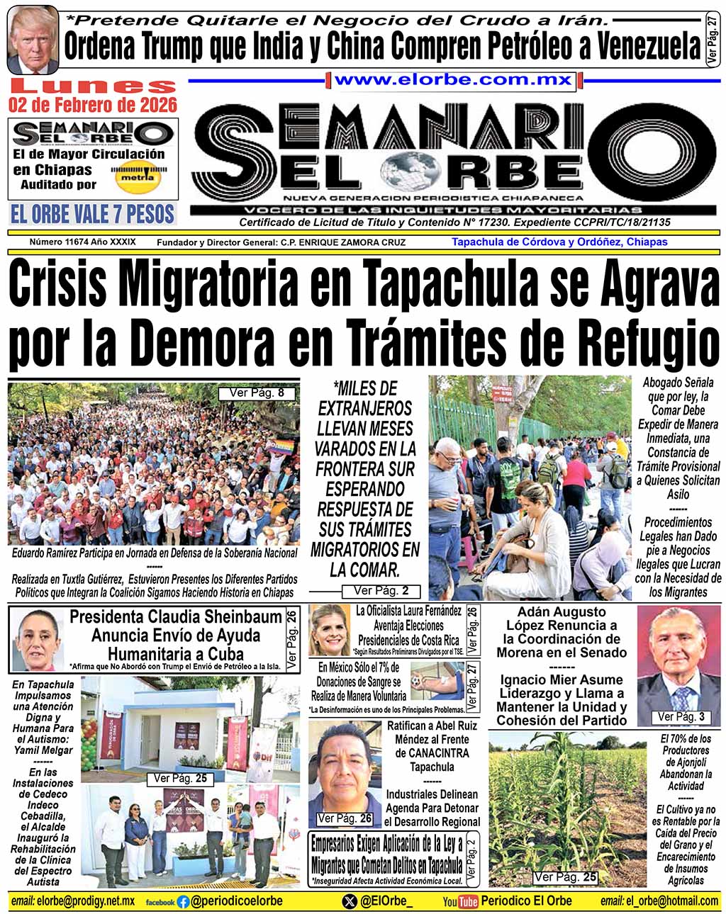 InicioPortadasFEBRERO 02 DE 2026 Portadas FEBRERO 02 DE 2026 2 febrero, 2026 0 124 Cuota FacebookTwitterPinterestWhatsAppEmail Cuota FacebookTwitterPinterestWhatsAppEmail Artículo anteriorAdán Augusto López Renuncia a la Coordinación de Morena en el SenadoArtículo siguientePresidenta Claudia Sheinbaum Anuncia Envío de Ayuda Humanitaria a Cuba RELATED ARTICLES Portadas FEBRERO 18 DE 2026 18 febrero, 2026 Portadas FEBRERO 17 DE 2026 17 febrero, 2026 Portadas FEBRERO 16 DE 2026 16 febrero, 2026 EL ORBE AL MOMENTO: Adolescente de 15 años es baleado tras persecución en motocicleta. Al Instante staff - 18 febrero, 2026 0 Tapachula, Chiapas a 18 de febrero 2026.– Un adolescente de 15 años resultó gravemente herido luego de ser atacado a balazos la noche de... Leer más Eduardo Ramírez impulsa la rehabilitación de la Ruta del Café en Tapachula Al Instante staff - 18 febrero, 2026 0 En Tapachula, el gobernador Eduardo Ramírez Aguilar dio inicio a los trabajos de rehabilitación de la Ruta del Café, con una inversión superior... Leer más Eduardo Ramírez impulsa la rehabilitación de la Ruta del Café en Tapachula Al Instante staff - 18 febrero, 2026 0 * Se destinarán más de 40 mdp en la pavimentación de distintos tramos y la construcción de un puente, beneficiando a más de... Leer más Cargar más MAS Popular Adolescente de 15 años es baleado tras persecución en motocicleta. 18 febrero, 2026 Eduardo Ramírez impulsa la rehabilitación de la Ruta del Café en Tapachula 18 febrero, 2026 Eduardo Ramírez impulsa la rehabilitación de la Ruta del Café en Tapachula 18 febrero, 2026 Viernes 13 de Marzo Julián Álvarez en Tapachula 18 febrero, 2026 Cargar más
