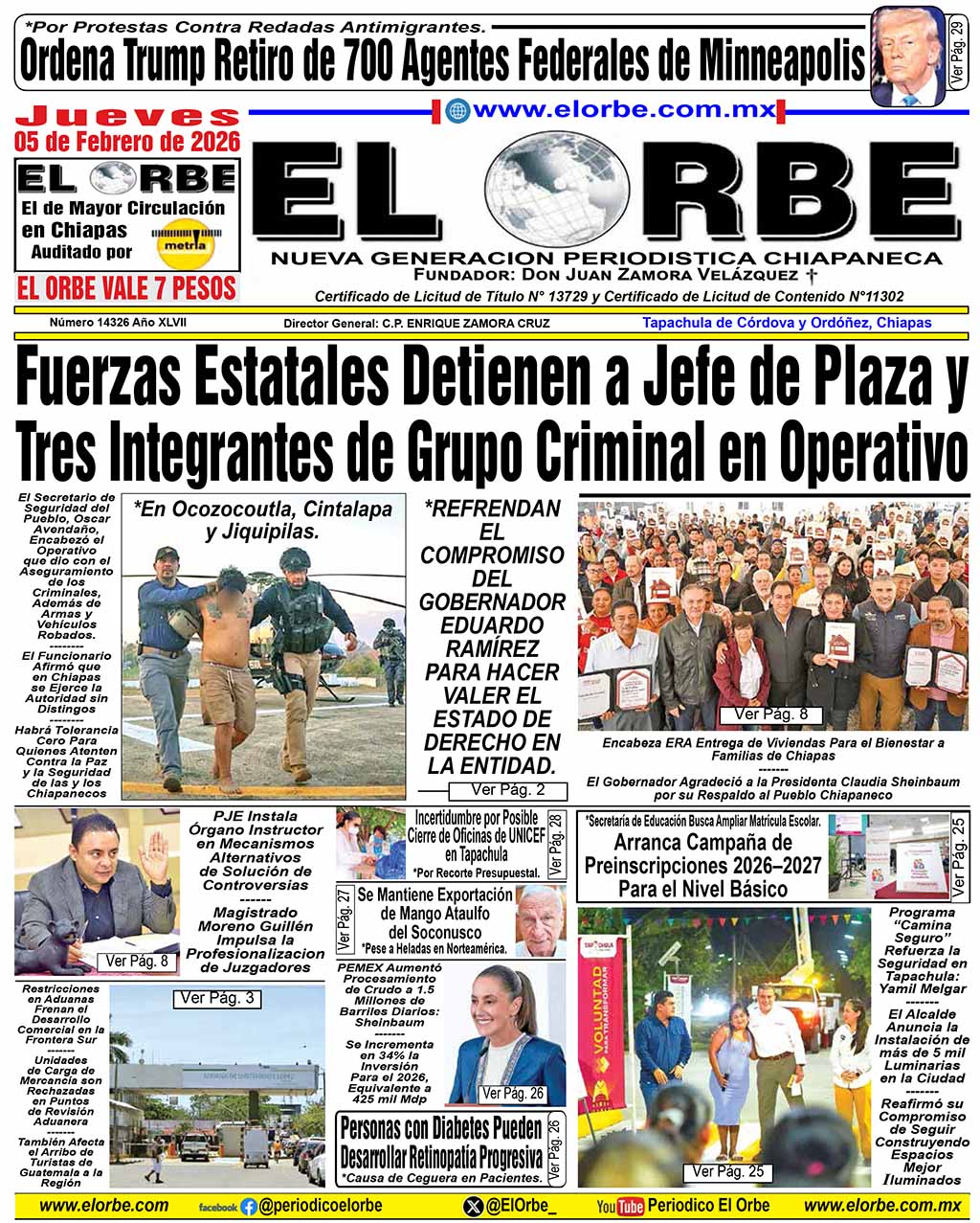 InicioPortadasFEBRERO 05 DE 2026 Portadas FEBRERO 05 DE 2026 5 febrero, 2026 0 1 Cuota FacebookTwitterPinterestWhatsAppEmail Cuota FacebookTwitterPinterestWhatsAppEmail Artículo anteriorComunicado Oficial RELATED ARTICLES Portadas FEBRERO 04 DE 2026 4 febrero, 2026 Portadas FEBRERO 03 DE 2026 3 febrero, 2026 Portadas FEBRERO 02 DE 2026 2 febrero, 2026 EL ORBE AL MOMENTO: Comunicado Oficial Al Instante staff - 4 febrero, 2026 0 Leer más “Siempre vamos a ejercer la autoridad, sin distingos”: Óscar Alberto Aparicio Avendaño Al Instante staff - 4 febrero, 2026 0 - Secretario de Seguridad del Pueblo encabeza detención de jefe de plaza y tres integrantes de grupo criminal La Secretaría de Seguridad del Pueblo (SSP),... Leer más Instala Poder Judicial del Estado, Órgano Instructor en Mecanismos Alternativos de Solución de Controversias Al Instante staff - 4 febrero, 2026 0 En el marco de las acciones sustantivas para la actualización de la justicia alternativa en la entidad, el Poder Judicial del Estado de Chiapas... Leer más Cargar más MAS Popular Comunicado Oficial 4 febrero, 2026 CAE “EL ESPÍRITU”, BRAZO DERECHO DE JUAN VALDOVINOS 4 febrero, 2026 “Siempre vamos a ejercer la autoridad, sin distingos”: Óscar Alberto Aparicio Avendaño 4 febrero, 2026 Instala Poder Judicial del Estado, Órgano Instructor en Mecanismos Alternativos de Solución de Controversias 4 febrero, 2026 Cargar más