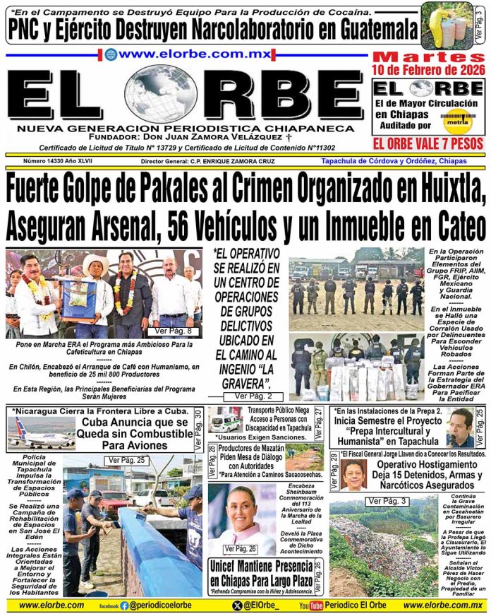 InicioPortadasFEBRERO 10 DE 2026 Portadas FEBRERO 10 DE 2026 10 febrero, 2026 0 16 Cuota FacebookTwitterPinterestWhatsAppEmail Cuota FacebookTwitterPinterestWhatsAppEmail Artículo anteriorPercance vehicular deja solo daños materiales en el centro de TapachulaArtículo siguientePNC y Ejército Destruyen Narcolaboratorio en Guatemala RELATED ARTICLES Portadas FEBRERO 09 DE 2026 9 febrero, 2026 Portadas FEBRERO 08 DE 2026 8 febrero, 2026 Portadas FEBRERO 07 DE 2026 7 febrero, 2026 EL ORBE AL MOMENTO: Conferencia de prensa matutina. Martes 10 de febrero 2026 | Presidenta Claudia Sheinbaum Al Instante staff - 10 febrero, 2026 0 Te invitamos a seguir la transmisión en vivo de la conferencia matutina: #MañaneradelPueblo, encabezada por la Dra. Claudia Sheinbaum Pardo, Presidenta Constitucional de los... Leer más Disfrutaron de una Especial Tarde Al Instante staff - 10 febrero, 2026 0 Disfrutando en familia, captamos a este grupo de personalidades que se dieron cita en reciente acontecimiento para celebrar a Vica. Leer más Percance vehicular deja solo daños materiales en el centro de Tapachula Al Instante staff - 9 febrero, 2026 0 lunes 9 de febrero 2026.- La tarde de este lunes, alrededor de las 15:00 horas, se registró un percance vehicular en el cruce de... Leer más Cargar más MAS Popular Fuerte Golpe de Pakales al Crimen Organizado en Huixtla, Aseguran Arsenal, 56 Vehículos y un Inmueble en Cateo 10 febrero, 2026 Conferencia de prensa matutina. Martes 10 de febrero 2026 | Presidenta Claudia Sheinbaum 10 febrero, 2026 Continúa la Grave Contaminación en Cacahoatán por Basurero Irregular 10 febrero, 2026 Inicia Semestre el Proyecto “Prepa Intercultural y Humanista” en Tapachula 10 febrero, 2026 Cargar más