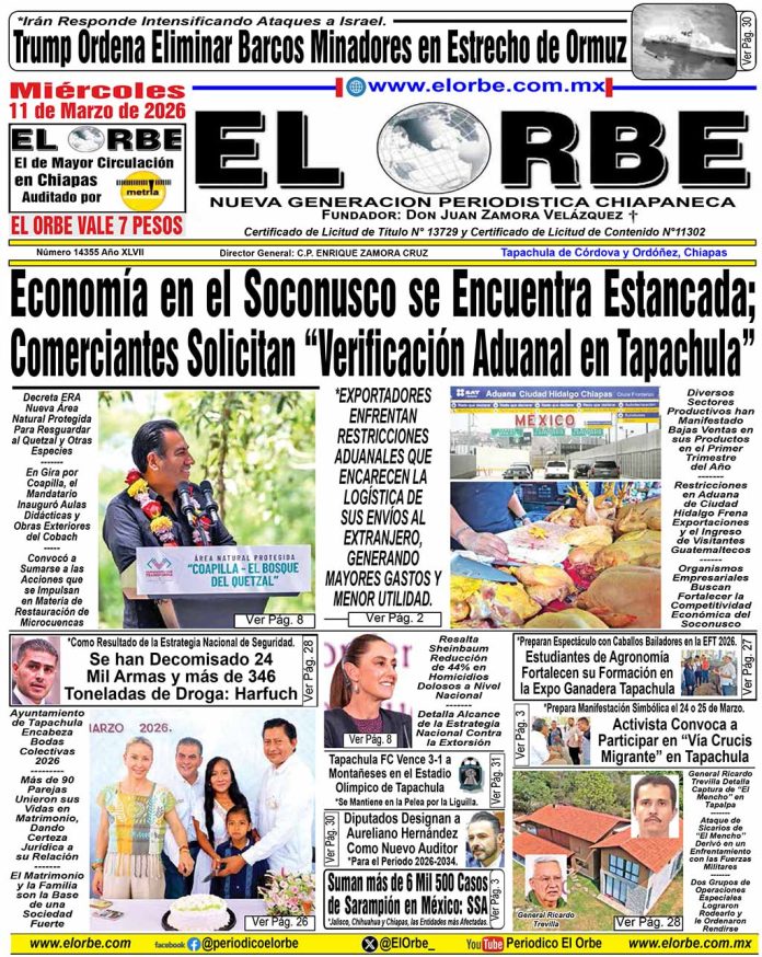 InicioPortadasMARZO 11 DE 2026 Portadas MARZO 11 DE 2026 11 marzo, 2026 0 14 Cuota FacebookTwitterPinterestWhatsAppEmail Cuota FacebookTwitterPinterestWhatsAppEmail Artículo anteriorResalta Sheinbaum Reducción de 44% en Homicidios Dolosos a Nivel NacionalArtículo siguienteMaylen I Inaugura el Rock Show en la Expo Feria Tapachula 2026 RELATED ARTICLES Portadas MARZO 10 DE 2026 10 marzo, 2026 Portadas MARZO 09 DE 2026 9 marzo, 2026 Portadas MARZO 08 DE 2026 8 marzo, 2026 EL ORBE AL MOMENTO: Este jueves Espinoza Paz en el Palenque de la Expo Tap 2026 Al Instante staff - 11 marzo, 2026 0 Leer más Conferencia de prensa matutina en vivo. Miércoles 11 de marzo 2026 | Presidenta Claudia Sheinbaum Al Instante staff - 11 marzo, 2026 0 Te invitamos a seguir la transmisión en vivo de la conferencia matutina: #MañaneradelPueblo, encabezada por la Dra. Claudia Sheinbaum Pardo, Presidenta Constitucional de los... Leer más Realizan Rodada Ciclista de Tapachula al Ejido Eureka Al Instante staff - 11 marzo, 2026 0 *En el Marco del 86 Aniversario de la Dotación de Tierras. El pasado domingo se llevó a cabo una rodada ciclista de Tapachula hacia el... Leer más Cargar más MAS Popular Se han Decomisado 24 Mil Armas y más de 346 Toneladas de Droga: Harfuch 11 marzo, 2026 Economía en el Soconusco se Encuentra Estancada: Comerciantes; Solicitan “Verificación Aduanal en Tapachula” Para Reducir Costos 11 marzo, 2026 Este jueves Espinoza Paz en el Palenque de la Expo Tap 2026 11 marzo, 2026 Conferencia de prensa matutina en vivo. Miércoles 11 de marzo 2026 | Presidenta Claudia Sheinbaum 11 marzo, 2026 Cargar más