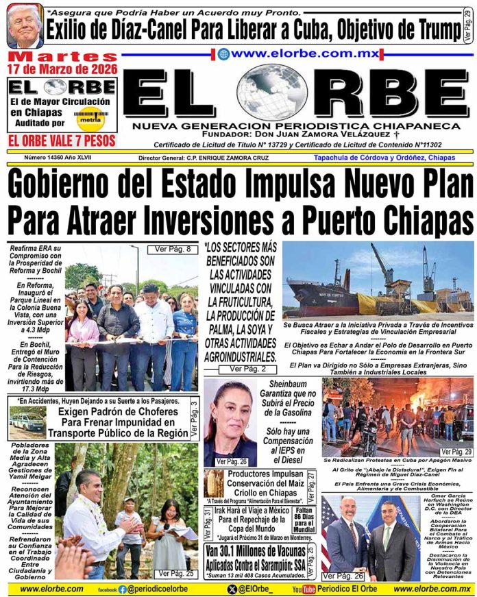 InicioPortadasMARZO 17 DE 2026 Portadas MARZO 17 DE 2026 17 marzo, 2026 0 4 Cuota FacebookTwitterPinterestWhatsAppEmail Cuota FacebookTwitterPinterestWhatsAppEmail Artículo anteriorAtaque armado en Tapachula deja un hombre sin vida en la colonia las delicias RELATED ARTICLES Portadas MARZO 16 DE 2026 16 marzo, 2026 Portadas MARZO 15 DE 2026 15 marzo, 2026 Portadas MARZO 14 DE 2026 14 marzo, 2026 EL ORBE AL MOMENTO: Ataque armado en Tapachula deja un hombre sin vida en la colonia las delicias Al Instante staff - 16 marzo, 2026 0 Tapachula, Chiapas; 16 de marzo de 2026.- Un hombre perdió la vida la noche de este lunes tras ser víctima de un ataque armado... Leer más Pobladores de la zona media y alta agradecen gestiones de Yamil Melgar Al Instante staff - 16 marzo, 2026 0 Habitantes de Pavencul y de los ejidos San Antonio de las Chicharras, 10 de Mayo y 5 de Mayo reconocen las acciones impulsadas para... Leer más Ejecutan a balazos a un hombre en colonia Las Delicias, Municipio de Tapachula. Al Instante staff - 16 marzo, 2026 0 El asesinado respondía al nombre de Andrés "N". Sujetos armados llegaron a la papelería y le dieron de balazos. Leer más Cargar más MAS Popular Ataque armado en Tapachula deja un hombre sin vida en la colonia las delicias 16 marzo, 2026 Pobladores de la zona media y alta agradecen gestiones de Yamil Melgar 16 marzo, 2026 Ejecutan a balazos a un hombre en colonia Las Delicias, Municipio de Tapachula. 16 marzo, 2026 Reafirma Eduardo Ramírez su compromiso con la prosperidad de Reforma y Bochil 16 marzo, 2026 Cargar más