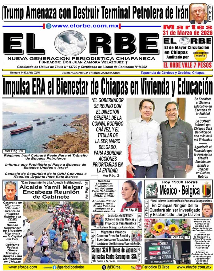 InicioPortadasMARZO 31 DE 2026 Portadas MARZO 31 DE 2026 31 marzo, 2026 0 11 Cuota FacebookTwitterPinterestWhatsAppEmail Cuota FacebookTwitterPinterestWhatsAppEmail Artículo anteriorTapachula no se detiene: Yamil Melgar encabeza reunión de gabineteArtículo siguienteCelebran 71 Aniversario de Elmira RELATED ARTICLES Portadas MARZO 30 DE 2026 30 marzo, 2026 Portadas MARZO 29 DE 2026 29 marzo, 2026 Portadas MARZO 28 DE 2026 28 marzo, 2026 EL ORBE AL MOMENTO: Celebran 71 Aniversario de Elmira Al Instante staff - 31 marzo, 2026 0 De manera especial y rodeada de afecto, la gentil Elmira Tovar Estrada celebró su 71 aniversario de vida en un conocido restaurante de la... Leer más Tapachula no se detiene: Yamil Melgar encabeza reunión de gabinete Al Instante staff - 30 marzo, 2026 0 Tapachula, Chiapas; lunes 30 de marzo de 2026.– El presidente municipal, Yamil Melgar, encabezó este lunes una reunión de trabajo con su gabinete, con... Leer más Nuestros visitantes y población local cuentan con la App C5 Escudo Pakal para cualquier emergencia: Óscar Aparicio Al Instante staff - 30 marzo, 2026 0 Tuxtla Gutiérrez, Chiapas; 30 de marzo de 2026.- Con el objetivo de garantizar unas vacaciones seguras en todo el territorio chiapaneco durante la... Leer más Cargar más MAS Popular Celebran 71 Aniversario de Elmira 31 marzo, 2026 Tapachula no se detiene: Yamil Melgar encabeza reunión de gabinete 30 marzo, 2026 Nuestros visitantes y población local cuentan con la App C5 Escudo Pakal para cualquier emergencia: Óscar Aparicio 30 marzo, 2026 En Chiapas ningún delito quedará sin ser investigado y esclarecido: Fiscal General 30 marzo, 2026 Cargar más