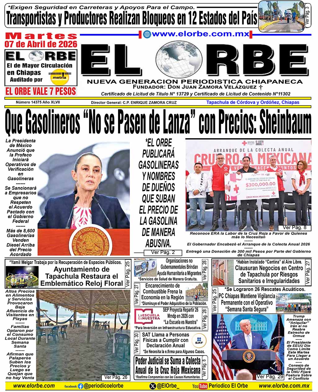 InicioPortadasABRIL 07 DE 2026 Portadas ABRIL 07 DE 2026 7 abril, 2026 0 15 Cuota FacebookTwitterPinterestWhatsAppEmail Cuota FacebookTwitterPinterestWhatsAppEmail Artículo anteriorTransportistas y Productores Realizan Bloqueos en 12 Estados del PaísArtículo siguienteReciben la Primavera con Alegre Convivencia RELATED ARTICLES Portadas ABRIL 06 DE 2026 6 abril, 2026 Portadas ABRIL 02 DE 2026 2 abril, 2026 Portadas ABRIL 01 DE 2026 1 abril, 2026 EL ORBE AL MOMENTO: Tapachula camina por el autismo Al Instante staff - 7 abril, 2026 0 Este sábado 18 de abril, sumémonos a una causa que nos invita a comprender, respetar e incluir. Participa en la caminata por el autismo, un... Leer más Conferencia de prensa matutina en vivo. Martes 07 de abril 2026 | Presidenta Claudia Sheinbaum Al Instante staff - 7 abril, 2026 0 Te invitamos a seguir la transmisión en vivo de la conferencia matutina: #MañaneradelPueblo, encabezada por la Dra. Claudia Sheinbaum Pardo, Presidenta Constitucional de los... Leer más Reciben la Primavera con Alegre Convivencia Al Instante staff - 7 abril, 2026 0 El Centro de Atención Infantil 3 (CAI), dirigido por la maestra Cecilia López, celebró la llegada de la primavera con una actividad especial en... Leer más Cargar más MAS Popular Que Gasolineros “No se Pasen de Lanza” con Precios: Sheinbaum 7 abril, 2026 Tapachula camina por el autismo 7 abril, 2026 SAT Llama a Personas Físicas a Cumplir con Declaración Anual 7 abril, 2026 Trump Amenaza con “Aniquilar” Irán si no Reabre Estrecho de Ormuz 7 abril, 2026 Cargar más