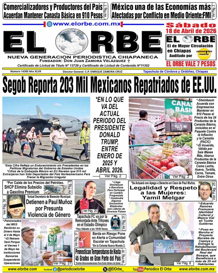 InicioPortadasABRIL 18 DE 2026 Portadas ABRIL 18 DE 2026 18 abril, 2026 0 14 Cuota FacebookTwitterPinterestWhatsAppEmail Cuota FacebookTwitterPinterestWhatsAppEmail Artículo anteriorEl INM realiza operativo nocturno. En la colonia 5 de febrero de Tapachula, Chiapas.Artículo siguienteProductores de Suchiate Exigen Transparencia en Ejecución de Proyectos Hídricos RELATED ARTICLES Portadas ABRIL 17 DE 2026 17 abril, 2026 Portadas ABRIL 16 DE 2026 16 abril, 2026 Portadas ABRIL 15 DE 2026 15 abril, 2026 EL ORBE AL MOMENTO: Foro Estudiantil del IMCP Chiapas Reúne a Jóvenes Universitarios Al Instante staff - 18 abril, 2026 0 El Instituto Mexicano de Contadores Públicos Chiapas realizó con éxito el Foro Estudiantil, donde participaron cerca de un centenar de universitarios en una jornada... Leer más El INM realiza operativo nocturno. En la colonia 5 de febrero de Tapachula, Chiapas. Al Instante staff - 17 abril, 2026 0 Leer más Legalidad y respeto a las mujeres: Yamil Melgar Al Instante staff - 17 abril, 2026 0 Tapachula, Chiapas; 17 de abril de 2026.- Ante los hechos recientes en los que se menciona a Paul Muñoz, secretario del Bienestar, reitero que... Leer más Cargar más MAS Popular Pronostican Temperaturas de Hasta 45 Grados en Gran Parte del País 18 abril, 2026 Segob Reporta 203 Mil Mexicanos Repatriados de Estados Unidos 18 abril, 2026 Irán Califica de Inaceptable Transferir su Uranio al Exterior 18 abril, 2026 Legalidad y Respeto a las Mujeres: Yamil Melgar 18 abril, 2026 Cargar más