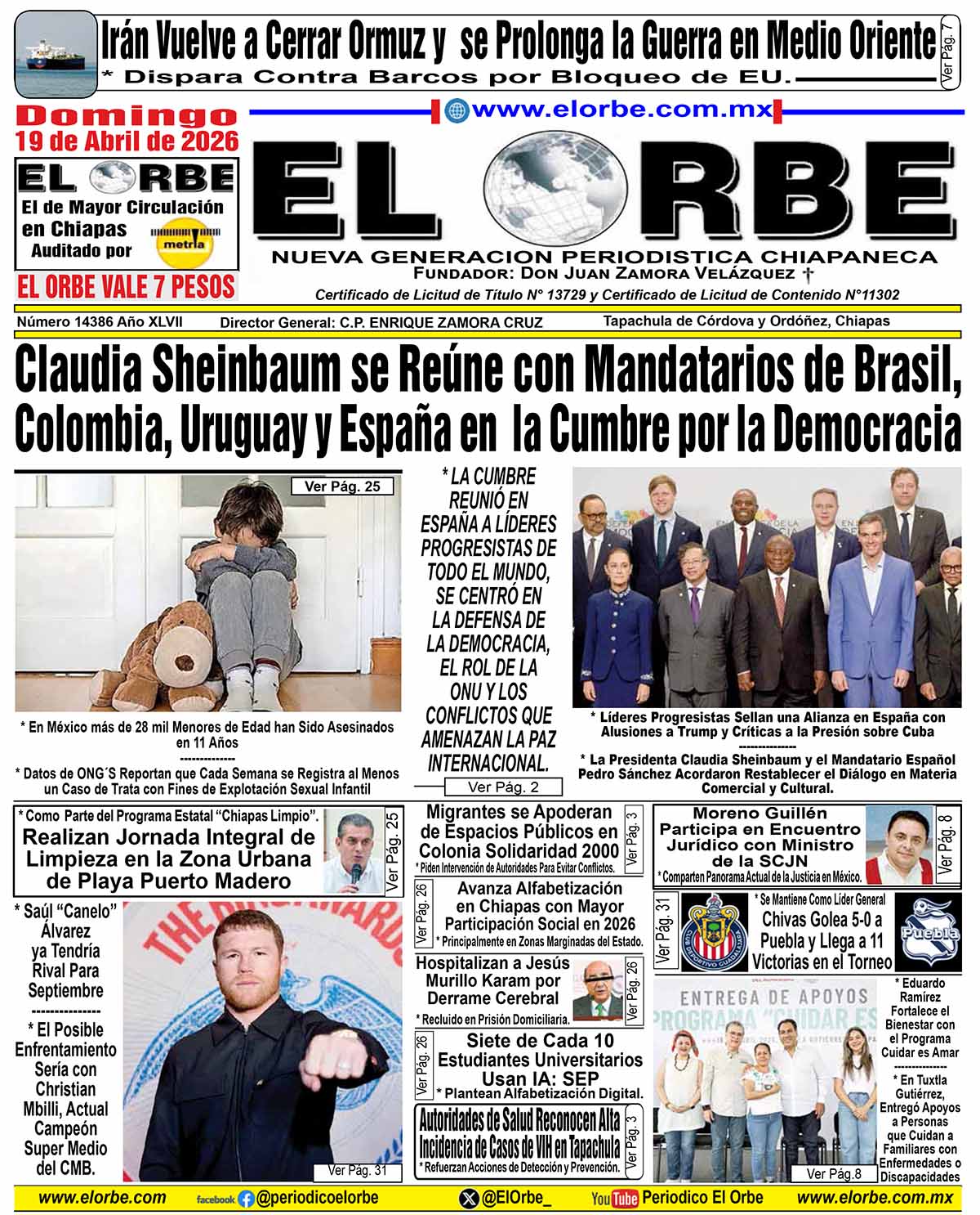 InicioPortadasABRIL 19 DE 2026 Portadas ABRIL 19 DE 2026 19 abril, 2026 0 16 Cuota FacebookTwitterPinterestWhatsAppEmail Cuota FacebookTwitterPinterestWhatsAppEmail Artículo anteriorAvanza Alfabetización en Chiapas con Mayor Participación Social en 2026Artículo siguienteAmérica Sorprende a Toluca con Doblete de Brian Rodríguez RELATED ARTICLES Portadas ABRIL 18 DE 2026 18 abril, 2026 Portadas ABRIL 17 DE 2026 17 abril, 2026 Portadas ABRIL 16 DE 2026 16 abril, 2026 EL ORBE AL MOMENTO: Claudia Sheinbaum se Reúne con Mandatarios de Brasil, Colombia, Uruguay y España en la Cumbre por la Democracia Al Instante staff - 19 abril, 2026 0 * LA CUMBRE REUNIÓ EN ESPAÑA A LÍDERES PROGRESISTAS DE TODO EL MUNDO, SE CENTRÓ EN LA DEFENSA DE LA DEMOCRACIA, EL ROL DE... Leer más Saul “Canelo” Álvarez ya Tendría Rival Para Septiembre Al Instante staff - 19 abril, 2026 0 * El Posible Enfrentamiento Sería con Christian Mbilli, Actual Campeón Super Medio del CMB. Ciudad de México, 18 de Abril.- Eddy Reynoso estuvo presente en... Leer más Hoy #Tapachula caminó por el autismo Al Instante staff - 18 abril, 2026 0 Hoy #Tapachula caminó por el autismo, reflejando la unión de familias, niñas, niños y jóvenes que se sumaron a una misma causa: construir un... Leer más Cargar más MAS Popular Aseguran Inmueble y Detienen a Cuatro en Operativo Policiaco 19 abril, 2026 Claudia Sheinbaum se Reúne con Mandatarios de Brasil, Colombia, Uruguay y España en la Cumbre por la Democracia 19 abril, 2026 Realizan Jornada Integral de Limpieza en la Zona Urbana de Playa Puerto Madero 19 abril, 2026 Migrantes se Apoderan de Espacios Públicos en Colonia Solidaridad 2000 19 abril, 2026 Cargar más