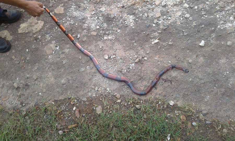 Los vulcanos procedieron a la captura del reptil, que era un venenoso coralillo y por seguridad de los moradores, fue sacrificado y enterrado a una profundidad adecuada ya que los huesos del animal si quedaban a flor de tierra podrían ocasionar una tragedia debido a que son venenosos. EL ORBE / Álvaro Islas Hernández
