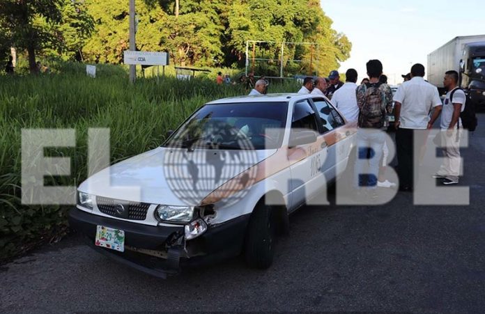 Tapachula, Chiapas.- Daños materiales y ninguna persona lesionada, fue el saldo del accidente que se registró en el cruce del Libramiento Sur Oriente y entrada al camino Lagartero. Un taxista no respetó la preferencia al salir e incorporarse al libramiento y fue golpeado por un motociclista repartidor de tortillas.