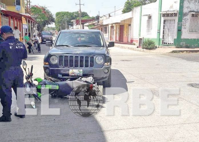 Tapachula, Chiapas; 17 de febrero.- Un accidente vehicular se registró en la 7ª avenida Sur Prolongación y 30ª calle Oriente, se involucraron un Jeep de color negro y una motocicleta en la que viajaban dos personas. Resultó lesionada la joven que iba como tripulante en la motocicleta, de nombre María Magdalena “N” de 22 años de edad.