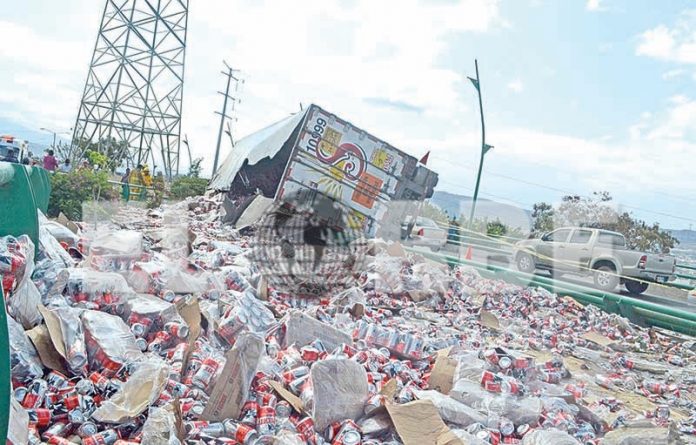 Tuxtla Gutiérrez, Chiapas; 6 de marzo.- Un tráiler que transportara cerveza volcó y una gran cantidad de peatones acarrearon cajas llenas de la bebida.