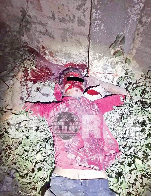 Aproximadamente a 40 metros de distancia se encontraba el otro cuerpo vestido con playera negra, pantalón azul de mezclilla y sin calzado. Presenta también diversas heridas de machete y desprendimiento parcial de la mano derecha.