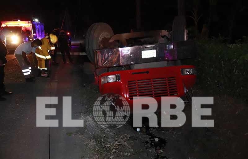Se trata de un camión marca Internacional, de color rojo, con placas de Chiapas, el cual estaba volcado en la cuneta junto a la carretera.