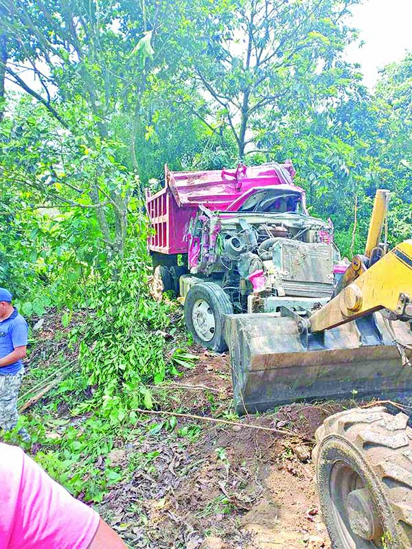 Tapachula, Chiapas; 25 de abril.- Conductores que transitaban sobre el tramo carretero que conduce de Tapachula hacia Carrillo Puerto, a la altura del rancho San Agustín Jitotol, reportaron que se había registrado un accidente automovilístico, cuando un camión de volteo se quedó sin frenos y se fue a un barranco.