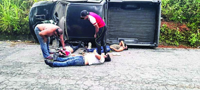 Tuzantán, Chiapas; 9 de Mayo.- Cuatro personas del sexo masculino resultaron con lesiones de gravedad tras sufrir una volcadura, a la altura de la ranchería Ricardo Naumann, antes de llegar al Ejido Francisco Sarabia segunda sección, del municipio de Tuzantán.