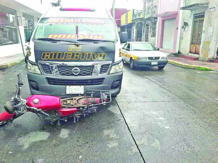 La colectiva es Nissan tipo Urvan que cubre la Ruta Libertad-El Carmen-Cobach, unidad marcada con el número económico 25-12, la cual circulaba de Sur a Norte sobre la 6a Avenida Sur y al llegar al cruce con la 4a Calle Poniente golpeó a un motociclista.