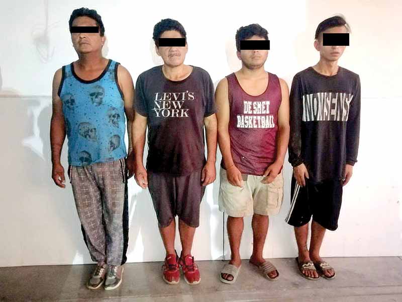 Se llevó a cabo el operativo para poder cercarlos y lograron asegurar a Jairo Jordán “N”, de 20 años de edad, con domicilio en Framboyanes; Daniel “N”, de 38 años de edad, alias “El Chilango”, habitante de la colonia El Confeti; José Antonio “N”, de 18 años de edad, con domicilio en la colonia “06 de Enero” y Víctor Hugo “N”, de 40 años de edad, habitante de la colonia Democracia; todos mexicanos.