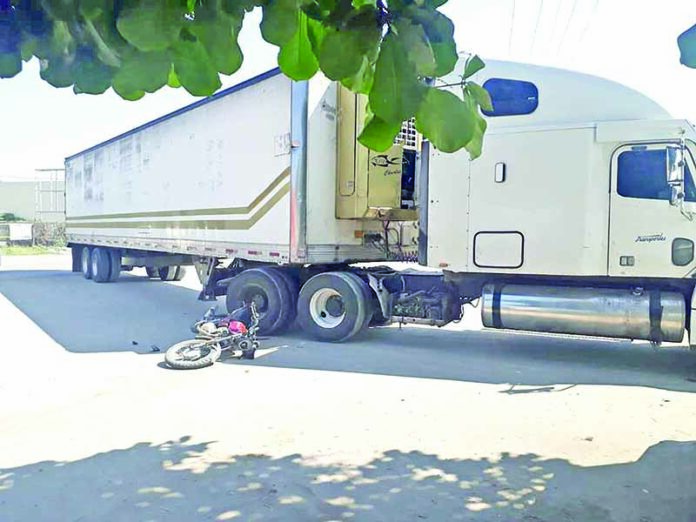 Suchiate, Chiapas; 12 de noviembre.- Alrededor de las 11:30 de la mañana, una mujer de nacionalidad hondureña conducía una motocicleta y se impactó contra un tráiler sobre la carretera Jaritas – Suchiate, a la altura de la gasolinera Repsol.