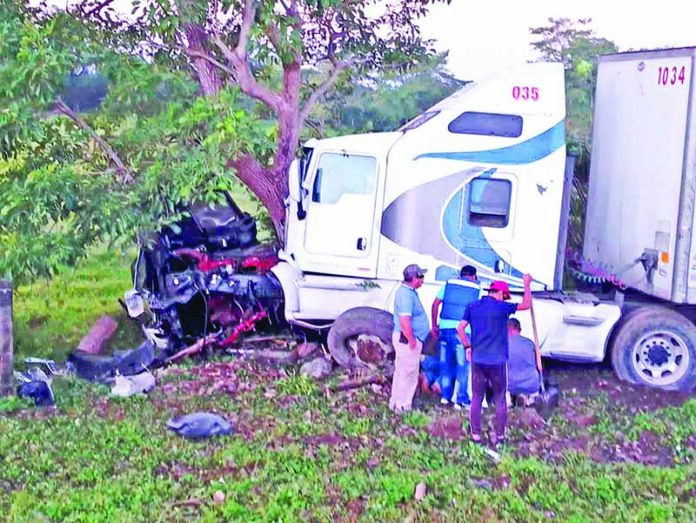 El conductor del tractocamión Kenworth de color blanco con placas de circulación del Servicio Público Federal, es propiedad de la empresa Triromo y al transitar a exceso de velocidad, sobre el tramo carretero que conduce de Pijijiapan hacia Mapastepec, perdió el control de su tractocamión y se salió de la carpeta asfáltica, hasta terminar chocado de frente contra un árbol de roble. Sólo hubo daños materiales.