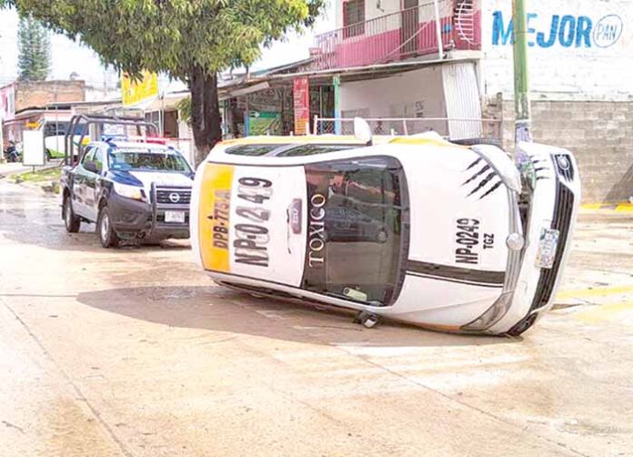 Tuxtla Gutiérrez, Chiapas.- Un taxista resultó ileso, al impactar contra un poste y terminar volcado en la 4ª Sur y 3ª Oriente de la colonia Terán, en la capital del estado.
